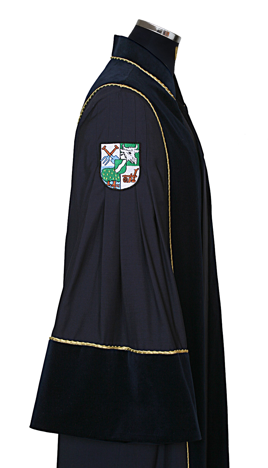 Het rugpand en de mouwen kunnen desgewenst voorzien worden van ingestikte plooien. De toga heeft een blinde knoopsluiting. Een geborduurd gemeentewapen kan op aanvraag worden vervaardigd en bevestigd op de toga. Daarnaast kunt u bij ons ook de ringkussens bestellen. Deze kussens worden voorzien van 2 ringbevestigingsgaten en tevens voorzien van het gemeentewapen.